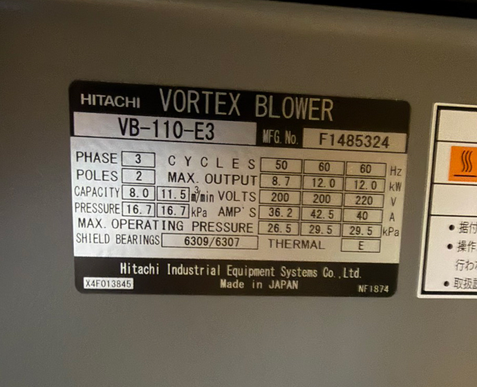 | 機械仕様 | 相数:3 極数:2 風量:8.0 11.5m3/min 圧力:16.7 16.7kPa シールドベアリング:6309/6307 耐熱クラス:E 周波数 : 50 / 60 / 60Hz 最大出力:8.7/12.0/12.0kW 電圧 :200/200/220V 電流 :36.2/42.5/40A 最大使用圧力:26.5/29.5/29.5kPa |